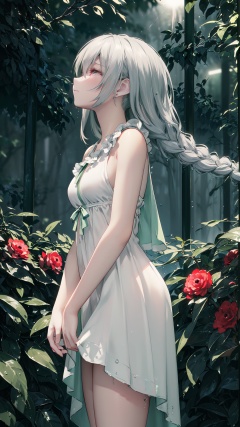 late at night,dark, light rain,dark, (((green, silver, glimmer)), limited palette, contrast, phenomenal aesthetic, best quality, sumptuous artwork, (masterpiece), (best quality), (ultra-detailed), (((illustration))), ((an extremely delicate and beautiful)), (detailed light), light rain,dark,(((camellia))), camellia, camellia,vines, forest, ruins, Blurred picture, lens flare, hdr, Tyndall effect,damp,wet, 1girl, bare shoulders, white hair, blinking, white dress, closed mouth, constel lation, flat color, braid, blinking, white robe, float, closed mouth, constel lation, flat color, looking up, standing, medium hair, standing, solo
