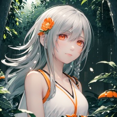 midrange portrait,late at night,dark, light rain,dark, (((green, silver, glimmer)), limited palette, contrast, phenomenal aesthetic, best quality, sumptuous artwork, (masterpiece), (best quality), (ultra-detailed), (((illustration))), ((an extremely delicate and beautiful)), (detailed light), light rain,dark,(((tangerine))), citrus, orange,vines, forest, ruins, Blurred picture, lens flare, hdr, Tyndall effect,damp,wet, 1girl, bare shoulders, white hair, blinking, white dress, closed mouth, constel lation, flat color, braid, blinking, white robe, float, closed mouth, constel lation, flat color, looking up, standing, medium hair, standing, solo