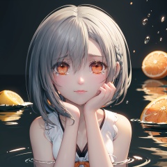 finely detail, Depth of field, (((masterpiece))), ((extremely detailed CG unity 8k wallpaper)), best quality, high resolution illustration, Amazing, intricate detail, (best illumination, best shadow, an extremely delicate and beautiful), Peeled oranges,(streaming tears), sad, orange tree,(orange), (orange), (orange), looking at viewer, both hands on own cheek, White shirt, (white hair, short hair, braid, bangs:1.2), (glowing eyes), ripples, dark water, In water,