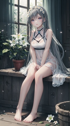 full_body, (((dark))), finely detail, (dark), Depth of field, (((masterpiece))), ((extremely detailed CG unity 8k wallpaper)), best quality, high resolution illustration, Amazing, intricate detail, (best illumination, best shadow, an extremely delicate and beautiful), (((Tyndall effect))), (((dense))), ((fog)), ((God's light)), (((backlight))), ((light leaks)), ((Airborne dust)), Hyacinthus orientalis L, Hyacinthus orientalis L, 1girl, plant, flower, potted_plant, solo, long_hair, lily_\(flower\), holding_flower, window, white_flower, earrings, leaf, sleeveless, vines, bare_shoulders, breasts, very_long_hair, curtains, sitting, bare_arms, vase, flower_pot, bare shoulders, white stockings, small breast, Low cut dress, ivy, jewelry, branch, (((No shoes))), bare feet, wet clothes, Wet stockings, Lily hair card, solo focus, finely detail, (bishoujo), blue_eyes, white_hair, (wet:1.3), bare shoulders, torn, water, Transparent clothes ,baisixuegao