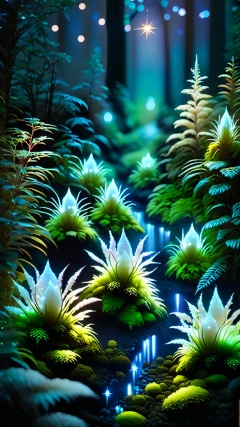 Continuing your stroll through the realm of mysterious plants, you discover a magical area called Starlight Magic Moss. The moss of these plants emits a shimmering light, dotting the surface like stars. Hidden among the moss are tiny Christmas lights, each one containing a mysterious magic. When night falls, the starlight magic moss emits a charming light, embellishing the entire area into a magical starlight forest.