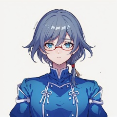 (masterpiece:1.3),(the best quality:1.2),(super fine illustrations:1.2),(Masterpiece),high quality,high detail,(white background:1.2),looking at viewer,(SOLO:1.4),outline,simplebackground,, hair ornament,puffy sleeves,low-tied long hair,low ponytail,belt,bangs,blue jacket,brown footwear,black legwear,boots,grey hair,long hair,long sleeves,hair between eyes,red-framed eyewear,fu hua,blue eyes,