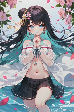 1girl, loli, fire, long_hair, jewelry, solo, navel, earrings, nail_polish, sunset, black_hair, sun, loli,Wearing a blue emerald smoked sweater, a pleated skirt with scattered flowers and mist and green grass, and a thin thin veil of light blue emerald water, the shoulders seem to be cut into a plain waist, and the skin looks like fat orchid.Fold your slender waist and take small steps, showing your bright wrists in light gauze.Her eyes are full of clear spring water, and a hollow gold hairpin is inserted diagonally into the bun on her head, dotted with purple jade, and tassels are sprinkled on her black hair.The fragrant and tender jade is more beautiful than flowers, the fingers are like peeled onions and the mouth is like vermilion, and every smile touches the heart and soul.Sleeping with spring water, her face is like gelatin, white jasmine smoke is soft gauze, white floor-length plum blossom skirt is flowing, and the body is tied with soft smoke.