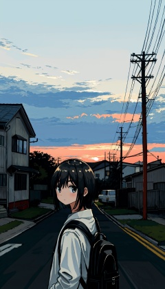 1girl, power lines, solo, cloud, sky, outdoors, black hair, backpack, cloudy sky, scenery, bag, utility pole, building, house, black eyes, looking at viewer