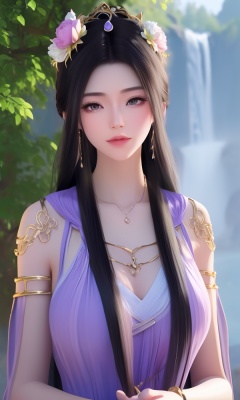 (,1girl, ,best quality, ),looking at viewer, <lora:395-DA-凡人修仙传-紫灵:0.8> ,,ultra detailed background,ultra detailed background,ultra realistic 8k cg, , ,masterpiece, (( , )),,, ultra realistic 8k cg, ,tamari \(flawless\),     ,peony \(flower\),   waterfall,    (()), (), , jewelry, necklace, solo, , , , hair_ornament, , earrings,large breasts,,  , ,