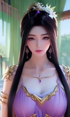 (,1girl, ,best quality, ),looking at viewer, <lora:395-DA-凡人修仙传-紫灵:0.8> ,ultra detailed background,ultra detailed background,ultra realistic 8k cg,, ,masterpiece, (( , )),, ,tamari \(flawless\),, hyper blossom,    (()), (), ,, , jewelry, necklace, solo, , , , hair_ornament, , earrings,large breasts,,  , ,
