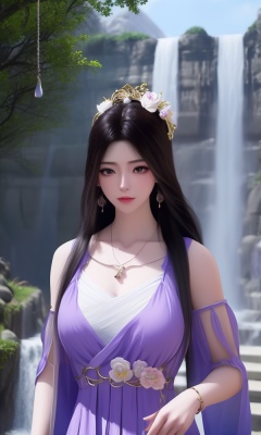 (,1girl, ,best quality, ),looking at viewer, <lora:395-DA-凡人修仙传-紫灵:0.8> ,,ultra detailed background,ultra detailed background,ultra realistic 8k cg, , ,masterpiece, (( , )),,, ultra realistic 8k cg, ,tamari \(flawless\),     ,peony \(flower\),   waterfall,    (()), (), , jewelry, necklace, solo, , , , hair_ornament, , earrings,large breasts,,  , ,