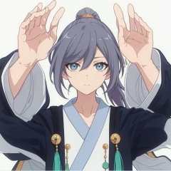 (masterpiece:1.3), (the best quality:1.2), (super fine illustrations:1.2), (Masterpiece), high quality, high detail,((white background:1.2)), looking at viewer, (SOLO:1.4),outline,,simple background,long sleeves, wide sleeves,fu hua,hair between eyes,ponytail,ornament,hair ornament,Grey hair,Chinese clothes,taoist robes, boots, long hair, blue eyes
