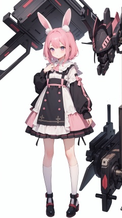 best quality, masterpiece, illustration, 1girl, solo, full body, Rabbit ear, White background, Mechanical, Mechanical body, Pink hair,