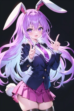 1girl, reisen_udongein_inaba, solo, long_hair, breasts, looking_at_viewer, open_mouth, bangs, skirt, shirt, thighhighs, long_sleeves, animal_ears, hair_between_eyes, medium_breasts, purple_eyes, jacket, tail, white_shirt, pink_hair, purple_hair, pleated_skirt, open_clothes, necktie, teeth, collared_shirt, black_thighhighs, pink_eyes, rabbit_ears, open_jacket, zettai_ryouiki, black_jacket, upper_teeth_only, blazer, red_necktie, black_background, rabbit_tail, pink_skirt, purple_skirt, rabbit_girl, finger_gun