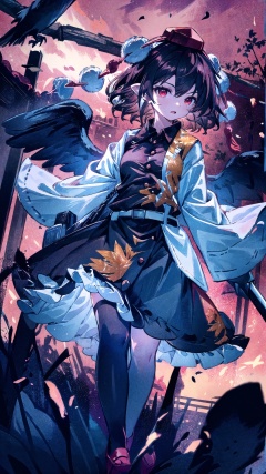 1girl, shameimaru aya, bird, hat, solo, skirt, red eyes, black skirt, shirt, crow, tokin hat, holding, thighhighs, white shirt, geta, book, pom pom (clothes), tassel, full body, looking at viewer, short hair, gloves, tengu-geta, black hair,  frilled skirt, holding book, bangs, red headwear, thigh strap, black gloves, coat, single thighhigh, frills, closed mouth, ribbon, socks, breasts, long sleeves, pen, brown hair, standing, red footwear, pointy ears, black ribbon, holding pen, black thighhighs, collared shirt, wings, belt