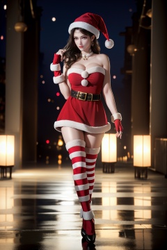 1girl,solo,very long hair,Santa's Hat,bare shoulders,belt,christmas,red dress,fingerless gloves,santa costume,striped thighhighs,(full_body:1.2),