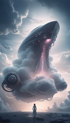 <lora:xl-shanbailing-1215白棱monster-000002:0.9>,bailing_monster,a huge monster is filled with clouds,scenery,a woman standing in the dark with her arms outstretched,a futuristic ship flying over the clouds,outdoors,