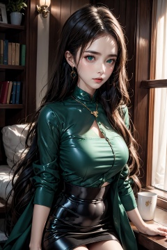 The original realistic portrait of a beautiful girl. She has a petite frame,  red and wavy hair that just falls past her shoulders,  surrounding a circular face with softness. her naturally arched red eyebrows over bright green eyes that look almost blue in some lights. The indoor background is grainy cinematic,  with godlyphoto r3al and detailmaster2,  an aesthetic portrait with cinematic colors,  earthy and naive. The appearance is cinematic with a fantasy vibe,  21yo girl,  office lady, pencil skirt,  red lips,  glint sparkle,  taoist robe,  chang,  Tight latex clothing,<lora:EMS-227407-EMS:0.700000>,<lora:EMS-90765-EMS:0.300000>