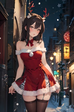 christmas dres,s1girl,christmas,bare shoulders,antlers,(cowboy shot close-up),standing,exquisite eyes,night,cityscape,snowing,striped stockings,elegant posture,(an extremely delicate and beautiful),(best quality),((masterpiece)),intricate detail,(masterpiece, high quality, best quality),<lora:christmas dress-000006:0.8>,