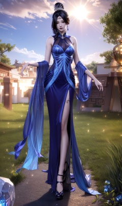 masterpiece,(best quality),official art, extremely detailed cg 8k wallpaper,((crystalstexture skin)), (extremely delicate and beautiful),highly detailed,1girl,solo,long hair,headwear,(standing),( hair),(( dress)),, (chinese_clothes),((long dress)),(long skirt),((full body,whole body)), (medium breasts),((hair_ornament)),,(sunshine, outdoor,),((looking_at_viewer)),((Facing the camera)),, <lora:hipoly3DModelLora_v10:0.3>