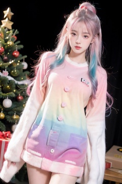 (Masterpiece, best picture quality,hd,8k,hd movie picture), girls,(Pink and white | gradient hair, gradient :1.2),fringe hair,buns,(cute and sexy | patch strips, advanced sense), graphic design, fashion, Standing in the Christmas tree and Christmas presents,sunyunzhu, Nebula