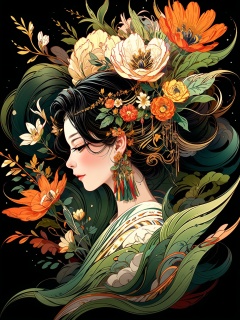 HTTP2, 1girl, closed eyes, flower, solo, black background, long hair, simple background, earrings, jewelry, black hair, white flower, green hair, pink flower, upper body, facial mark, leaf, profile, hair ornament<lora:HTTP_20231214132158:1> <lora:more_details:0.6>