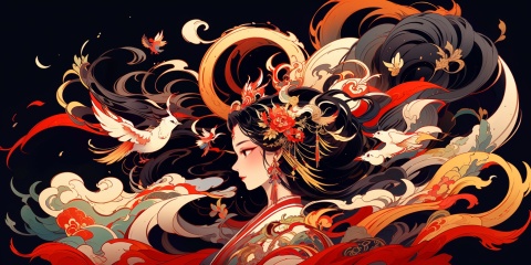 HTTP2, 1girl, long hair, black hair, jewelry, earrings, profile, solo, dragon, upper body, hair ornament, red eyes, horns, from side, eastern dragon, bird, floating hair, nail polish <lora:HTTP_20231214132158:1>