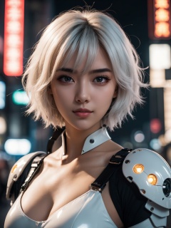 photographic of a girl, solo, white short hair, bangs, glowing, animification, glowing eyes, glitch, Gorgeous face with details, long eyebrows. Big and cute eyes. Cinematic lights hands_in_pockets, cinematic lighting, strong contrast, wuxia, holding weapon, dragon, machinery, Mecha, CGArt Mayfly. BREAK, 35mm photograph, grainy, professional, 8k, highly detailed, Hasselbald 50mm lens f/1.9,[by ethan for CGArt Mayfly model], Face Score