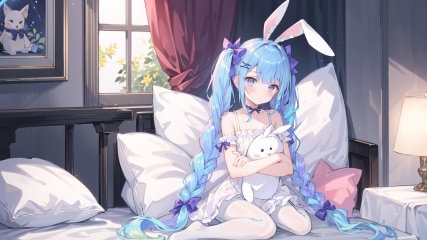 1girl, solo, underwear, panties, thighhighs, twintails, sitting, wariza, wings, bangs, bow, blush, bandaid, hairclip, signature, pillow, collarbone, choker, holding, frills, babydoll, ribbon, animal ears, stuffed toy, stuffed animal, stuffed bunny, blue eyes, long hair, hair ornament, rabbit ears, white panties, object hug, white thighhighs, no shoes, purple hair, looking at viewer, very long hair, low twintails, bare shoulders, garter straps, mini wings, closed mouth, holding stuffed toy, hair bow, full body, bed sheet, star (symbol), hair ribbon