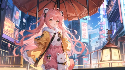amusement park carousel ferris_wheel,a girl wearing a fluffy animal kigurumi pajamas ,