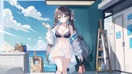 hanakoba,oversized_shirt,bra_strap,bottomless,no panties, huazi, 1girl, shirt, solo, large breasts, cleavage, white shirt, smile, bow, hair bow, blush, water, wet clothes, wet, see-through long sleeves,wet shirt, collared shirt, very long hair side braid