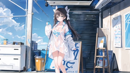hanakoba,oversized_shirt,bra_strap,bottomless,no panties, huazi, 1girl, shirt, solo, large breasts, cleavage, white shirt, smile, bow, hair bow, blush, water, wet clothes, wet, see-through long sleeves,wet shirt, collared shirt, very long hair side braid