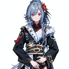 (masterpiece:1.3),(the best quality:1.2),(super fine illustrations:1.2),(Masterpiece),high quality,high detail,(white background:1.2),looking at viewer,(SOLO:1.4),outline,simple background,, hair over one eye,ponytail,senti,hair flower,polearm,chinese clothes,grey hair,hair ornament,red eyes,solo,