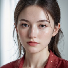 RAW photo,portrait of a beautiful woman wearing a red shirt (high detailed skin:1.2),8k uhd,dslr,soft lighting,high quality,film grain,Fujifilm XT3,upper body,cute face,eye level,focus on eyes,dappled light on face,pale skin,no make-up,detailed face and eyes,natural skin texture,highly detailed skin,textured skin,skin pores,[[[oiled shiny skin]]],skin blemish,imperfect skin,intricate skin details,visible skin detail,detailed skin texture,subsurface scattering,blush,few freckles,few moles,goosebumps,minor skin imperfections,skin pores,[[[wrinkles]]],vitiligo spots,whiteheads,blackhead,white pimples,red pimples,beauty spot,[[[[skin fuzz]]]],remarkable detailed pupils,detailed iris,very thin eyebrows,