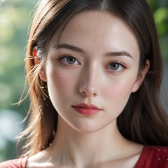 RAW photo,portrait of a beautiful woman wearing a red shirt (high detailed skin:1.2),8k uhd,dslr,soft lighting,high quality,film grain,Fujifilm XT3,upper body,cute face,eye level,focus on eyes,dappled light on face,pale skin,no make-up,detailed face and eyes,natural skin texture,highly detailed skin,textured skin,skin pores,skin blemish,imperfect skin,intricate skin details,visible skin detail,detailed skin texture,subsurface scattering,blush,few freckles,few moles,goosebumps,minor skin imperfections,skin pores,[[[wrinkles]]],vitiligo spots,whiteheads,blackhead,white pimples,red pimples,beauty spot,remarkable detailed pupils,detailed iris,very thin eyebrows,