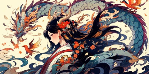 1girl, long hair, black hair, jewelry, earrings, profile, solo, dragon, upper body, hair ornament, red eyes, horns, from side, eastern dragon, bird, floating hair, nail polish