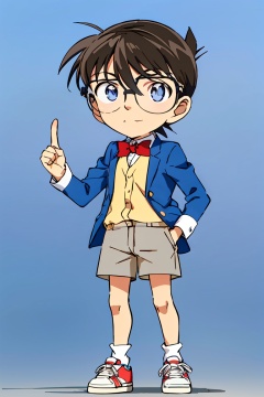 1boy, male child, glasses, one eye closed, male focus, blue eyes, solo, red bow, bowtie, grey shorts, brown hair, red bowtie, bow, blue jacket, shorts, pointing, child, white socks, sneakers, shoes, looking at viewer, jacket, full body, standing, hand in pocket, bangs, pointing at viewer, short hair, black-framed eyewear, socks, shirt, blue background, closed mouth, hair between eyes, white shirt