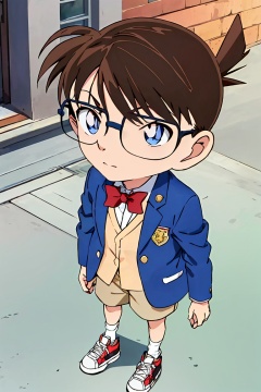 (best quality, masterpiece),1boy, solo,skateboarding, glasses, blue eyes, male child, male focus, bowtie, shorts, red bowtie, bow, brown hair, blue jacket, red bow, long sleeves, shoes, sneakers, jacket