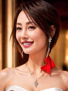 1girl, jewelry, black hair, necklace, solo, brown eyes, smile, realistic, looking at viewer, dress, short hair, hair ornament, bare shoulders, lips, strapless, grin, upper body