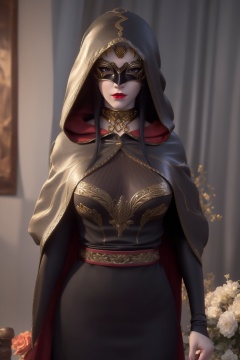 ltra realistic 8k cg, flawless, clean, masterpiece, professional artwork, famous artwork,cinematic lighting, cinematic bloom, perfect face, beautiful face,shenfengMeiDuShaPiFeng,1girl, solo,red lips,jewelry,torogao, black dress,belt,cape,choker,hood,hood up,mask,standing,black hair, long hair, necklace,looking at viewer,hair ornament, breasts,large breasts,hiqcgbody,<lora:shenfengMeiDuShaPiFeng_20231216135824-000002:0.7>,