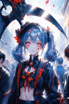 mid_shot:1.9,(masterpiece, best quality, highres, ultra detailed, absurdres:1.2),<a girl,solo,Perfect small body,purple eyes,small breasts:1.6,payot:1.3,(blue hair,silver streaked hair,very long twintails):1.6,wavy very long hair,loli:1.9),skinny,>,<1hand holding the ((mechanical huge Scythe up)):1.6>,<sailor,sailor collar,sailor hat,miniskirt,navel cutout,black garter belt stockings:1.3,>,<portrait,>,<multiple boys,zombie:1.3,Splatted blood,ugly man, glowing eyes,blood, guro horror or horror \(theme\),rotting,undead,etc,crowd>,<lora:menghuangan_max:0.7>,<lora:add_more_details:0.5>,<lora:fanguang_V1-000014:0.6>,