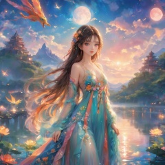 officialart, unity8kwallpaper, ultradetailed, beautifulandaesthetic, beautiful, masterpiece, bestquality, (zentangle, mandala, tangle, entangle), (ecstasyofflower:1.2)dynamicangle, cowboyshot, themostbeautifulformofchaos, elegant, abrutalistdesigned, vividcolours, romanticism, atmospheric, 1girl, twintails, long hair, ((the background is the magic sky castle)), ((magic jungle)), ((ancient god beast)), elegant beautiful girl, wearing a colorful fantasy evening gown, (the moonlight at night), the prospect is colorful lake water, misty magic ship, (the bright moon:1.2), (girl in colorful sci-fi leotard dress), (the future of the grand sci-fi background:1.5), realistic movie quality, wet_swimsuit, (pantylines:1.5), the magic creature phoenix separated from the character, (pantyhose:1.2), (panties_under_pantyhose:1.2), ((pantyhose)), (the girl is accompanied by strange magical creatures:2), there is lake water in the background, (colorful translucent wedding dress:1.4), (\shen ming shao nv\), Anime style, arien_hanfu, fur_coat,, masterpiece, best quality,