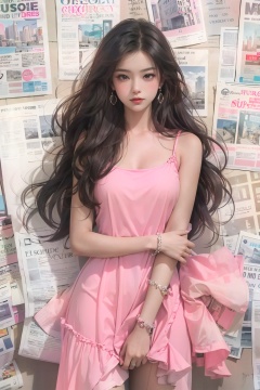 a woman in a pink dress posing for a picture in front of a wall with newspapers on it and a magazine, 1girl, black hair, building, city, cityscape, dress, earrings, jewelry, long hair, newspaper, pink dress, real world location, ring, skyline, skyscraper, solo, tokyo \(city\)