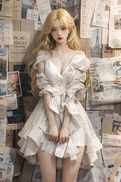 a painting of a woman in a white dress with a red lip and a red nose standing in front of a wall of papers, 1girl, blonde hair, building, city, dress, long hair, newspaper, paper, sheet music, solo, white dre