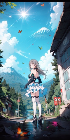 realistic, octane render, 3D CG, [(simple background:1.6)::5],Dynamic angle,[Bottle bottom], (1girl:1.3), art by makoto shinkai (flat color:1.3),colorful,floating colorful wind,(Highest picture quality), (Master's work), (Detailed eye description),(imid shot,macro shot:1.25),(8K wallpaper), (Detailed face description),depth of field,(lens flare),floating colorful water, (floating colorful mount fuji:1.3),floating colorful traffic light,roadblock,railing,ruins,moss,floating rain,stream,wilderness,small dust, ((breeze)), wind, summer,sunlight, (railway:1.3), (blurry background), road by the sea,ruins,station, (An abandoned roadside station:1.5) ,Mountains and forests,water,wading,partially_submerged,(Strong sunlight:1.2),(Altocumulus:1.2),bird, butterfly, falling petals, (from back,from below:1.1), (fisheye:1.2), full body,standing,looking back, looking to the side,