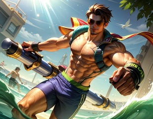 (masterpiece, best quality,top quality),(wide shot:0.95),league of legends,Dynamic angle,solo,1man,male focus,handsome face,young man,swim_trunks,muscular,pectorals,chest hair,looking at viewer,brown hair,depth_of_field,particle effects,<lora:【moba】lol淘宝款:0.8>,over the sea,sunlight,water gun,sunglasses,