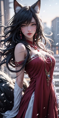 Ahri,1girl,solo,animal ears,long hair,breasts,fox ears,ahri \(league of legends\),black hair,(facial mark:1.5),looking at viewer,fox tail,tail,bare shoulders,red dress,jewelry,yellow eyes,dress,whisker markings,snowing,bangs,lips,blurry,hair between eyes,blurry background,multiple tails,