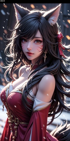 Ahri,1girl,solo,animal ears,long hair,breasts,fox ears,ahri \(league of legends\),black hair,(facial mark:1.5),looking at viewer,fox tail,tail,bare shoulders,red dress,jewelry,yellow eyes,dress,whisker markings,snowing,bangs,lips,blurry,hair between eyes,blurry background,multiple tails,
