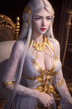 ltra realistic 8k cg, flawless, clean, masterpiece, professional artwork, famous artwork,cinematic lighting, cinematic bloom, perfect face, beautiful face,shenfengBaiLong,1girl, solo,red lips,jewelry,smile, dress,white dress,bangs,circlet,eyelashes,eyeshadow,wide sleeves,standing, long hair, white hair,gold chain,makeup,necklace,looking at viewer,hair ornament,breasts,large breasts,cleavage,hiqcgbody,<lora:shenfengBaiLong_20231217162206-000004:0.7>,