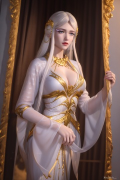ltra realistic 8k cg, flawless, clean, masterpiece, professional artwork, famous artwork,cinematic lighting, cinematic bloom, perfect face, beautiful face,shenfengBaiLong,1girl, solo,red lips,jewelry,smile, dress,white dress,bangs,circlet,eyelashes,eyeshadow,wide sleeves,standing, long hair, white hair,gold chain,makeup,necklace,looking at viewer,hair ornament,breasts,large breasts,cleavage,hiqcgbody,<lora:shenfengBaiLong_20231217162206-000004:0.7>,