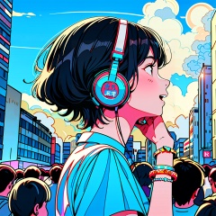 HTTP, headphones, 1girl, shirt, crowd, black hair, sky, cloud, profile, outdoors, solo focus, short sleeves, print shirt, upper body, nail polish, short hair, blue nails, blue shirt, building, bracelet, jewelry, hand up, open mouth, day<lora:HTTP_20231211123040-000008:1>