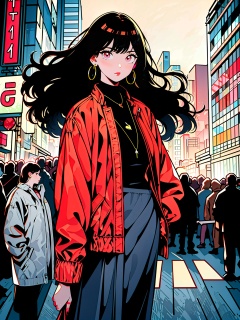 HTTP, 1girl, black hair, long hair, jewelry, earrings, skirt, red nails, jacket, red eyes, grey skirt, looking at viewer, red jacket, outdoors, solo, bangs, solo focus, long sleeves, black shirt, cowboy shot, crowd, necklace, shirt, city, building, nail polish, standing, hand on hip<lora:HTTP_20231211123040-000008:1>