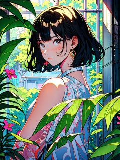 HTTP, 1girl, solo, black hair, plant, earrings, leaf, jewelry, looking at viewer, brown eyes, flower, upper body, bangs,  medium hair, looking back, short hair<lora:HTTP_20231211123040-000008:1>