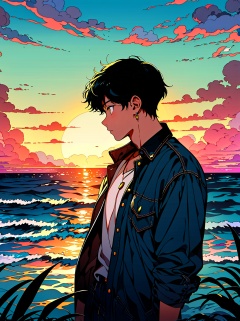 HTTP, solo, profile, cloud, jewelry, short hair, 1boy, sunset, male focus, outdoors, earrings, shirt, upper body, pocket, breast pocket, sky, plant, sun, necklace, yellow eyes, black hair, cloudy sky, ocean, leaf, water, horizon <lora:HTTP_20231211123040-000008:1>